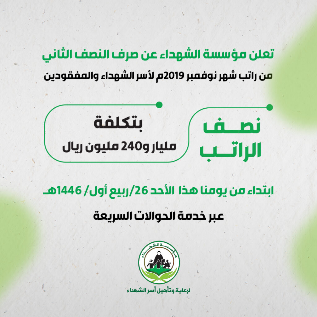 اعلنت مؤسسة الشهداء لرعاية وتأهيل أسر الشهداء اليوم عن صرف نصف راتب شهر نوفمبر من العام 2019م لجميع أسر الشهداء والمفقودين بإجمالي مليار و240مليون ريال
